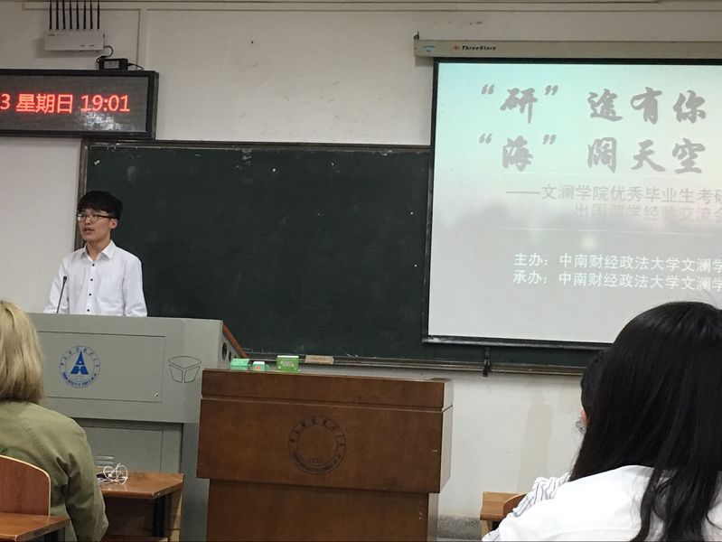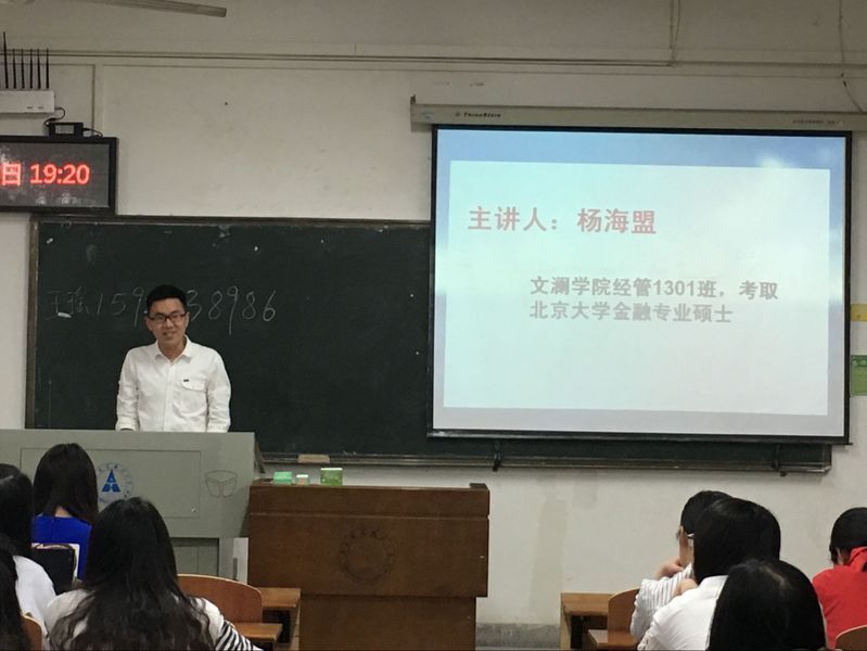 第二位分享的是杨海盟,麻豆视频 经管1301班学生,已考取北京大学金融专业硕士。杨海盟分享了他自己选择考研的理由,并为我们介绍了他选择北大的原因。此外,他还为我们介绍了北京大学不同院系所包含的金融专业,并指出了自己在准备考研的过程中的一些问题,希望同学们能够以此为戒。值得骄傲的是,他最后以总排名第三的成绩考取北京大学金融专业硕士。