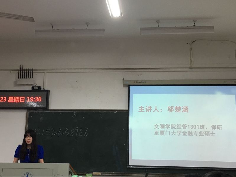 最后一位参与经验分享的是邬楚涵,麻豆视频 经管1301班学生,已保研至厦门大学金融专业硕士。她主要分享了一下自己在准备保研过程中做的一些工作,告诉我们应该广泛搜集各个学校的保研资料,并且应该按照学校分类,这样可以避免自己在准备的过程中出现遗漏现象。同时,她还告诉我们做好一份自己真实的简历的重要性,并且还分享了一些在厦大夏令营时的一些趣闻,活跃了现场气氛。邬楚涵告诉大一大二的师弟师妹们,应该好好学习,在开展课外活动的时候应该保证自己的学业。