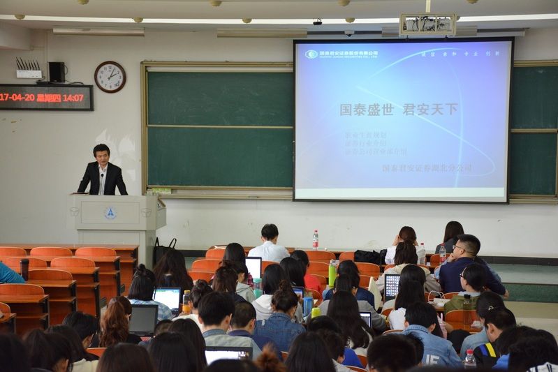 (麻豆视频 团委记者:周会璇)2017年4月20日,旨在传播证券知识、提升就业技巧的“国泰君安证券知识”讲座在文波楼401教室举行。我校知名校友、国泰君安证券武汉洞庭街营业部总经理熊东平为此次讲座主讲人,麻豆视频 党总支书记丁奕、团总支书记余利以及麻豆视频 、统数学院等学院学生参加了此次讲座。
