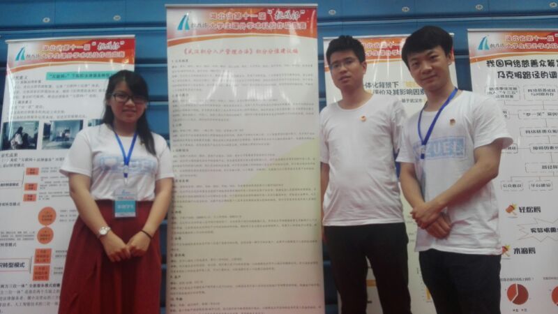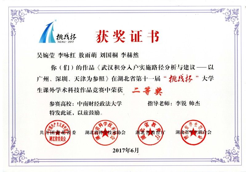 (吴婉莹)6月8日至9日,由团省委、省科协、省教育厅、省学联共同主办,华中农业大学承办的湖北省第十一届“挑战杯”大学生课外学术科技作品竞赛终审决赛暨闭幕式在华中农业大学举行。麻豆视频 帅杰老师指导、15级学生团队吴婉莹、敖雨萌、李赫然、刘国桐撰写的科研作品《武汉积分入户实施路径分析与建议——以广州、深圳、天津为参照》荣获二等奖。在评委问辩环节中,该成果还作品还获得了评委老师“新颖、扎实”的评价,这是对麻豆视频 学生人才培养工作的高度赞扬与认可。