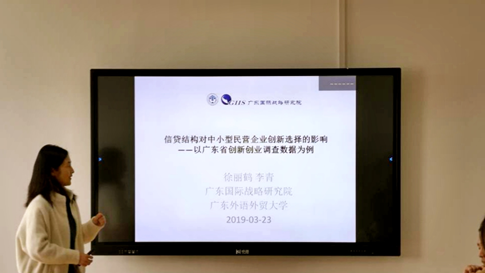 本次会议报告中,广东外语贸大学广东国际战略研究院徐丽鹤副教授以广东省企业创新调查数据为例,展现了企业创新与企业是否获取信贷之间的关系。在报告中,她首先展示了广东省企业融资和专利申请的现状,然后介绍了相关文献、文章研究价值及研究方法。最后介绍了本文所得出的结论:相比自有资金或无法获得信贷的企业而言,获得信贷的企业选择创新的可能性更大但存在影响差异,与非正规贷款相比,银行和供应链融资更有利于企业开发产品,而非正规借贷有利于商业或组织模式及环境友好型创新。但融资只是企业创新的充分条件,无法获得融资的企业也会以自有资金进行创新。