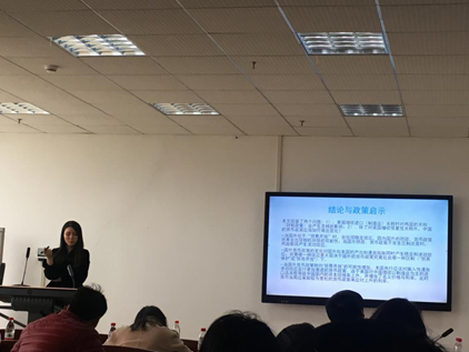 图为万倩博士作报告:“《劳动合同法》、地区劳动报保护强度与私营企业出口行为”