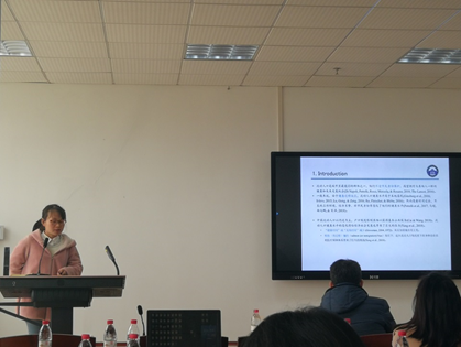 图为武汉大学经济与管理学院在读博士邹甘娜进行了题为“贸易保护下中国宏观经济波动与应对策略研究——基于两国模型分析”的报告。
