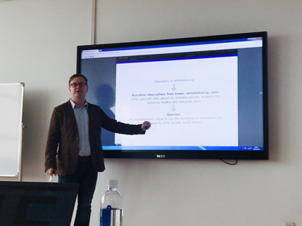 在本次讲座中,Gergely Horvath老师基于一个泄密模型实验,分析了责任分散效应的相关问题。老师首先对泄密(Whistleblowing)和责任分散(Diffusion of Responsibility)的概念结合实例进行了解释,并对国外学者对研究情况进行了介绍。他接着详细讲述了文章中使用的模型,在该信息不对称模型中,存在内幕消息知情人(insiders)和外部人员(outsiders)两方,实验围绕“如何分配罐子中的金钱”展开,生动有趣,便于理解。老师最后分析了实验结果并得出了结论,当只有一个知情人可以泄密时,该知情人泄密的概率更高,而当他意识到还有另外的内部人员可以泄密时,他就更不愿意泄密,因为泄密行为本身存在成本。研究还发现,当只有一个知情人可以泄密时,他泄密的概率与罐子中金钱的数量没有显著的关系,而当有两个可以泄密的内部人员时,罐子中的金钱越多,知情人泄密的可能性就越小。该实验结果基本符合责任分散效应。