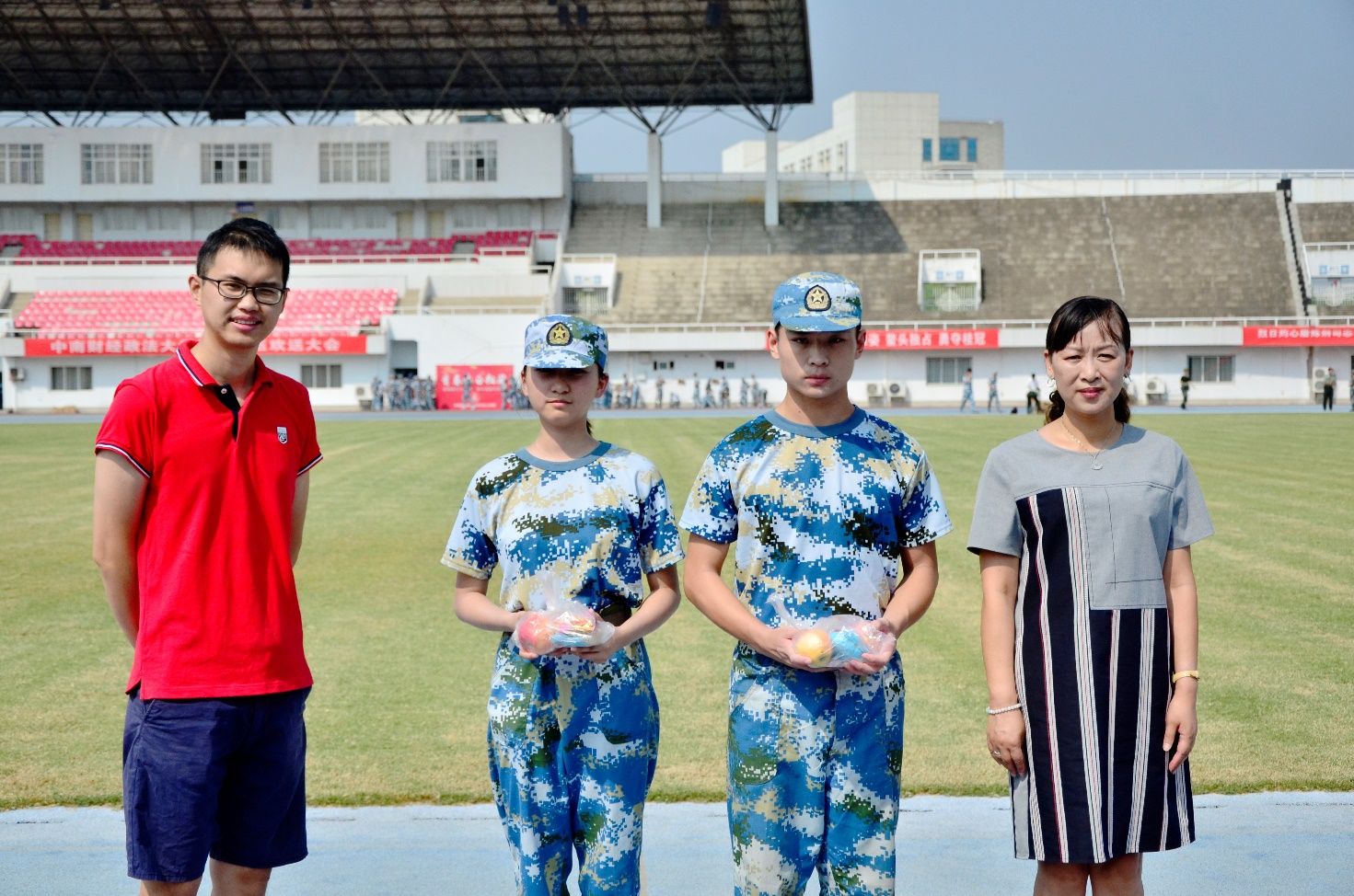 在酷热的训练场上,同学们迫不及待地打开了慰问品。新生表示,看到院领导如此关心军训的新生感觉非常的荣幸和感动,在之后的几天军训中一定会更加努力,为学院争光。(记者/纪婕任延溶 刘千惠)