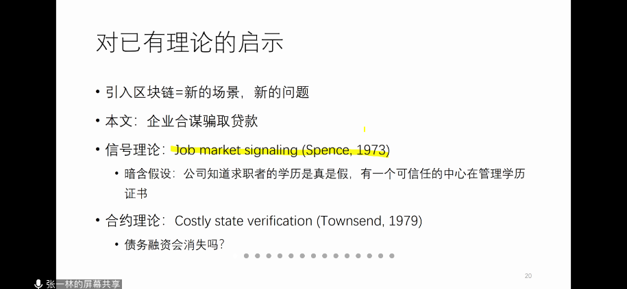 最后,老师提出本文的结论:区块链在确保信息不被篡改进而降低信息验证成本的同时,也增加了技术研发等方面的成本,只有当参与区块链的中小企业的数量达到一定规模从而形成规模经济,并且引入信息交叉验证机制能够确保上链信息的真实性时,中小企业的融资成本才会下降。