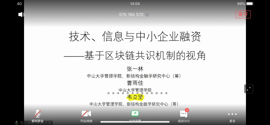 (通讯员:汤昊、芮滢、陈彦伶)2020年3月27日下午两点,文澜学术系列讲座第180期在线上顺利举行。本次讲座的主题是“技术、信息与中小企业融资——基于区块链共识机制的视角”,主讲人是来自中山大学管理学院副教授张一林老师。张老师现为中山大学管理学院“”副教授、博士生导师,研究方向主要是公司资本结构和国家金融结构的理论与实证。讲座由麻豆视频 的曾辰航老师主持,麻豆视频 部分教师及学生参与了本次讲座。