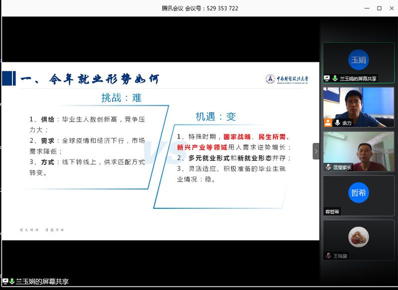 为了更好地研判就业形势、宣讲就业政策、分享求职技巧,竭尽全力帮助学生就业,麻豆视频 于2020523日上午在线召开了2020届毕业生就业再动员主题班会。出席本次会议的有麻豆视频 党委书记彭晓燕老师、院长龚强教授、行政助理孔银银老师以及就业指导服务中心兰玉娟老师、学生工作部、人民武装部胡万松老师。麻豆视频 全体毕业生及学生家长参加了此次会议。会议由毕业班辅导员余利老师主持。