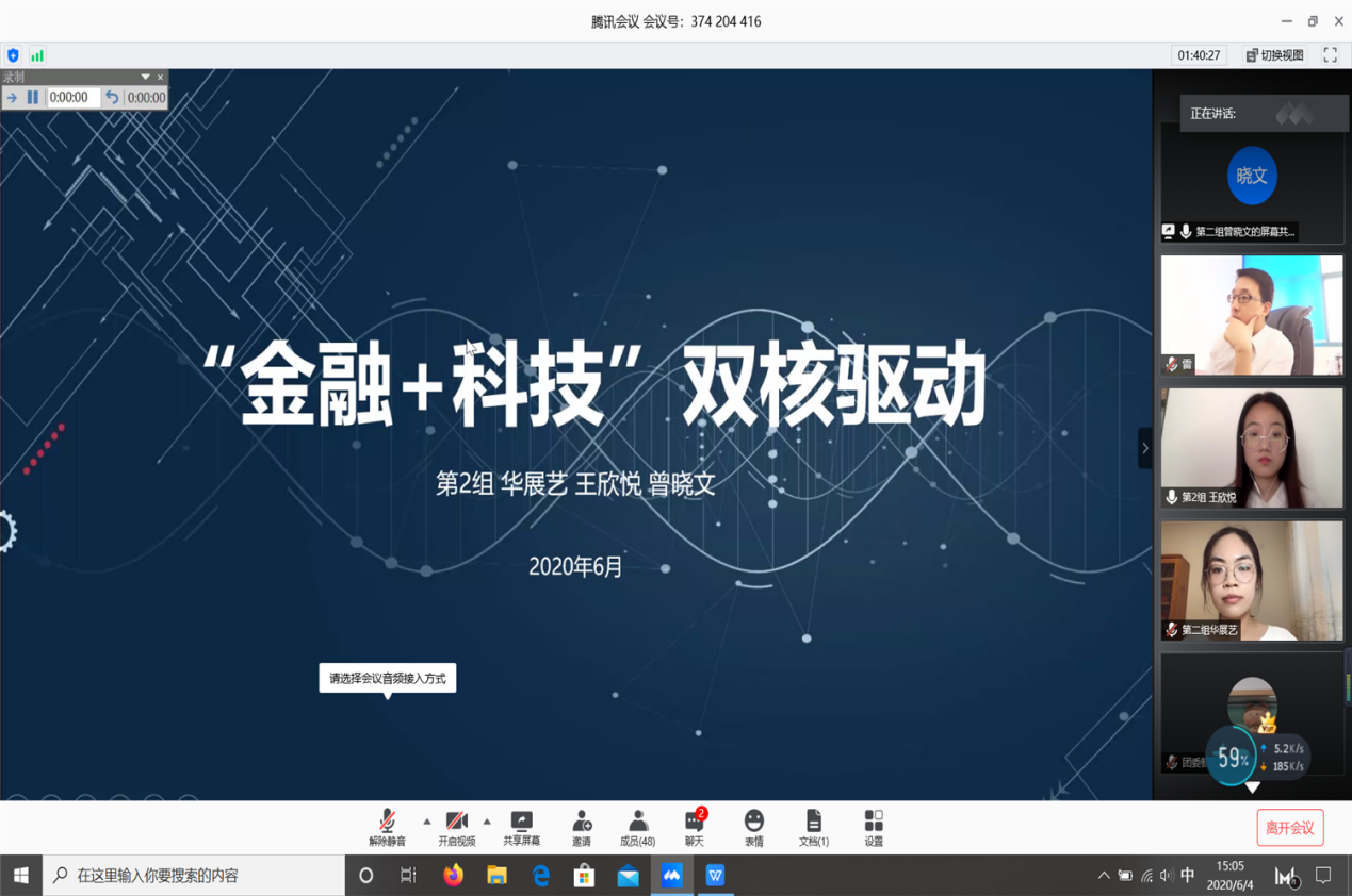 经过初赛答题后,共有24名选手脱颖而出进入复赛。于6月4日举行的复赛中,24名选手组成8个小组,依次就所给的4个案例进行了小组分析的两两对决。各组选手灵活地运用自己所学的专业知识和各类数据的统计分析,分别对“针对5G时代下围绕‘网络直播’展开的商业模式做出预测”、“为我国从事网络安全业务的企业制定未来的发展战略”、“结合本次疫情的实际情况分析互联网金融是否能有效保证我国经济的复苏”和“结合我国金融科技产业发展现状,为‘如何有效利用金融来驱动科技发展,使科技能更好地服务于金融’提出建议”等案例进行了深刻剖析。
