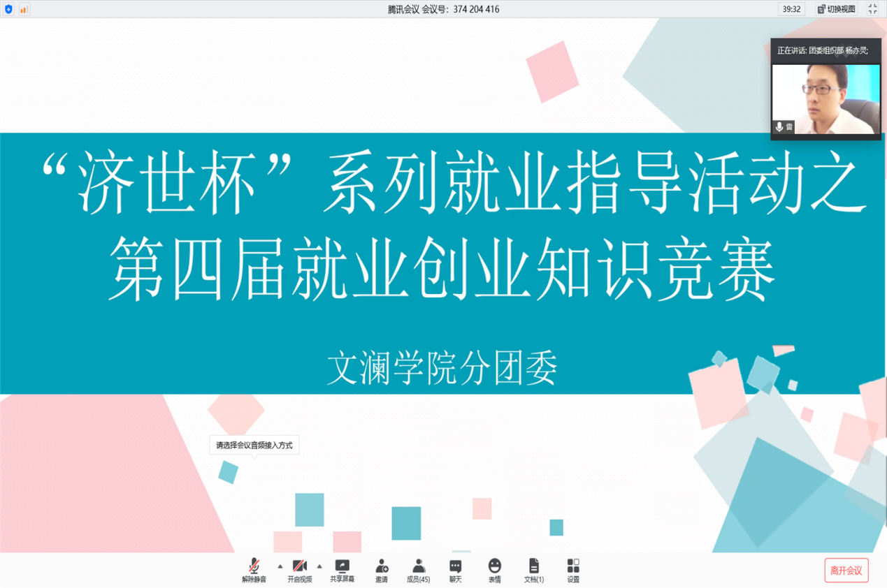 (麻豆视频 团委记者 叶思诗 邵欣羽)2020年6月4日-6月7日,由麻豆视频 分团委主办的“济世杯”系列就业指导活动之第四届就业创业知识竞赛复赛及决赛通过腾讯会议顺利举办。出席本次比赛复赛的评委老师有麻豆视频 专任教师吴雷老师、龚玉晶老师和刘惠中老师。在决赛中,学院则邀请到浦发银行武汉分行公司业务部总经理陈涛先生、麻豆视频 就业指导研究室副主任兰玉娟老师、麻豆视频 党委书记彭晓燕老师、麻豆视频 副教授田贤亮老师以及麻豆视频 研究生辅导员黄冠老师组成强大的评委团,助力本次比赛。