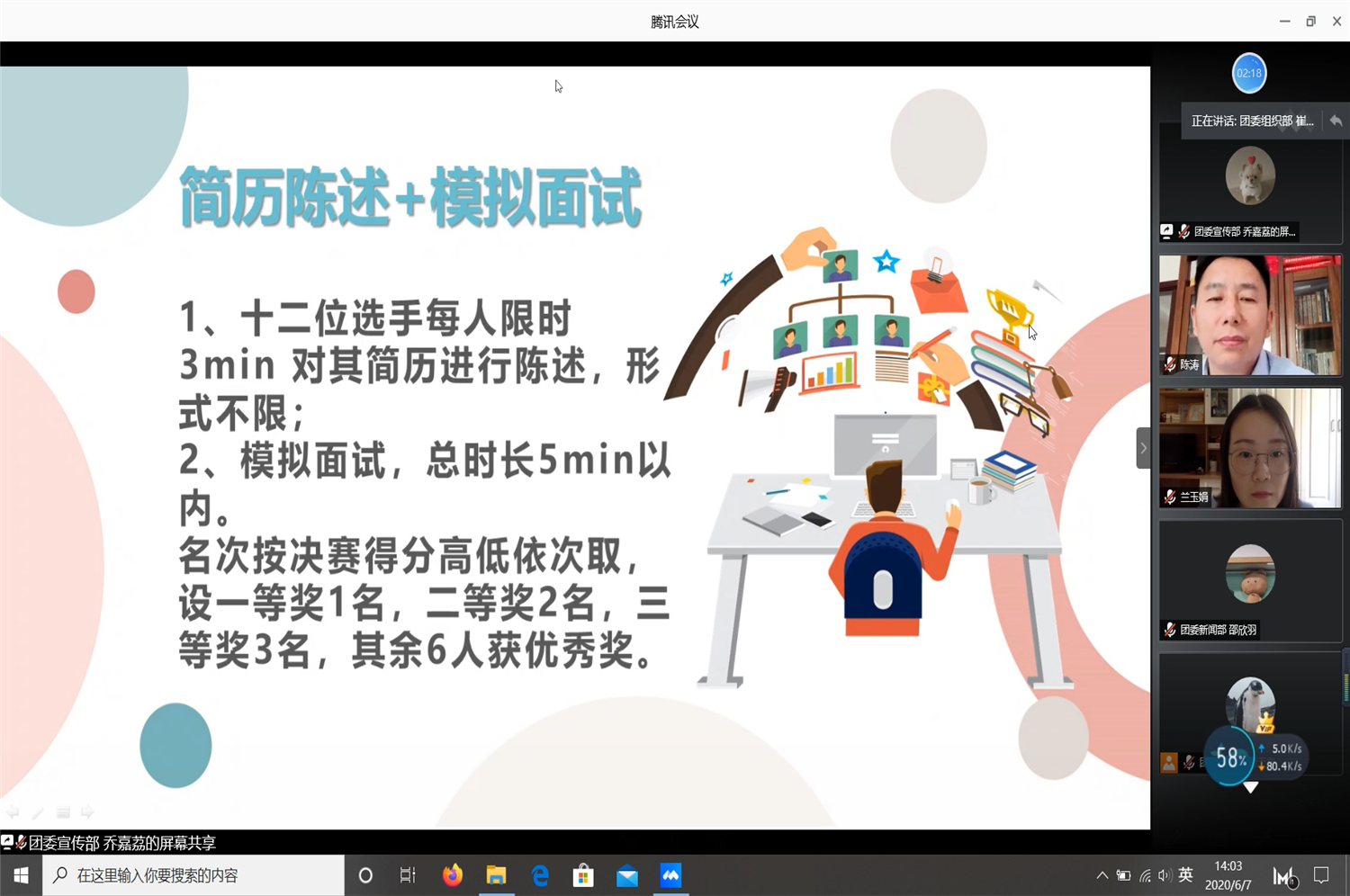67日举行的决赛则主要分成两个板块:简历介绍和模拟面试。12名参赛选手通过PPT的形式对自己的优异成绩和丰富经历进行了精彩的介绍,同时展望了自己的职业生涯,展现了优秀青年的活力。