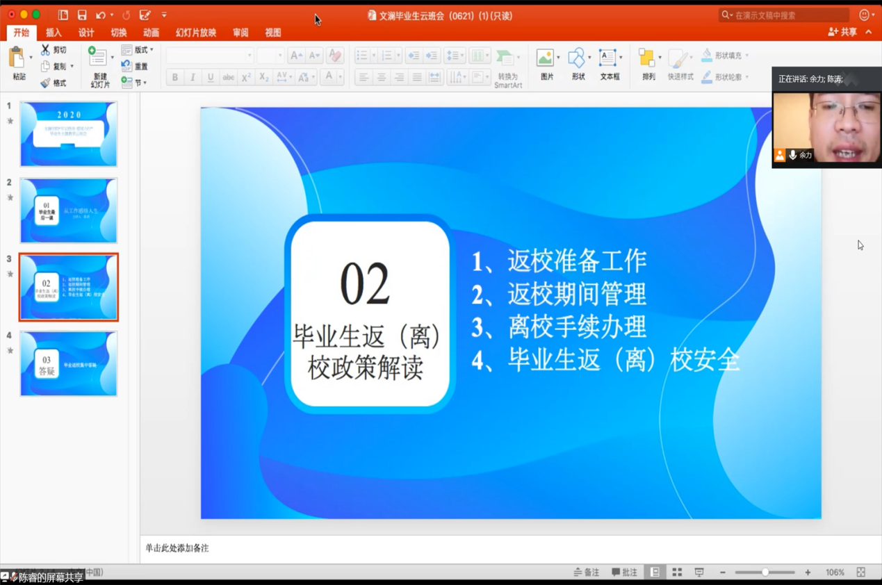 最后,余老师回答了毕业生比较关心的宿舍卫生问题、就餐问题,同时简单介绍了返校后对毕业生的管理政策,让学生能够消除担心,安心返校。最后余利老师详细讲述了离校手续的办理流程,回答了学生尚且还不清楚的问题。在毕业生的感谢中,本次会议圆满结束。