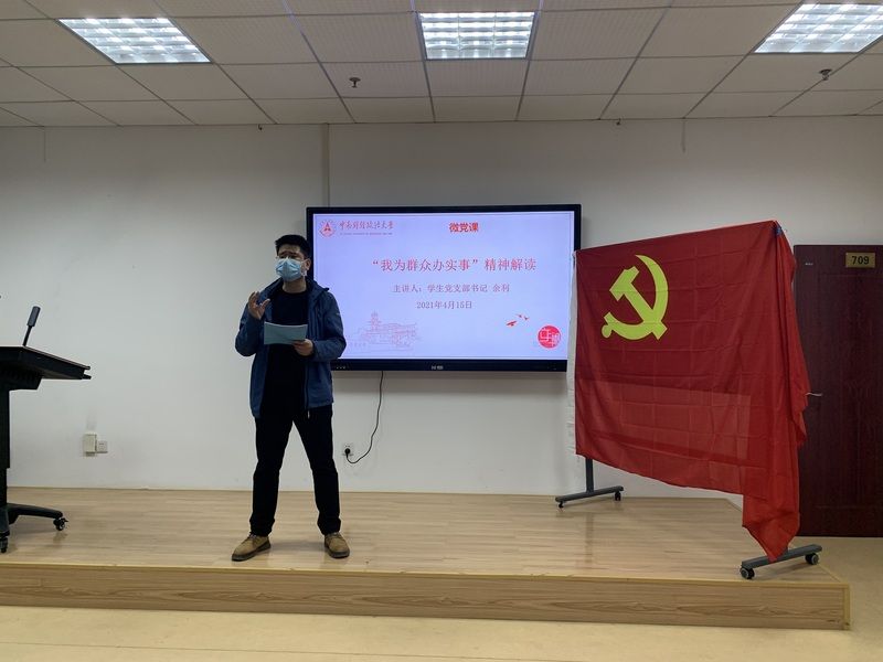 会议第二项,余利老师讲授“‘我为群众办实事’精神解读”主题微党课。首先,余利老师回顾了2021年2月20日习近平总书记在党史学习教育动员大会上的讲话精神:要切实为群众办实事解难题。余老师随后提到,开展“我为群众办实事”的实践活动,应当以弘扬党的光荣传统、优良作风,践行党的初心使命、根本宗旨,强化公仆意识、为民情怀为目标,发挥基层党组织战斗堡垒作用、党员的先锋模范作用和党员领导干部表率作用。最后,余老师向我们介绍学院近期通过开展院领导接待日活动落实学生意见收集反馈机制,鼓励全体党员进行党员先锋岗争创行动和党员结对帮扶困难同学行动,进一步落实“我为群众办实事”的宗旨。