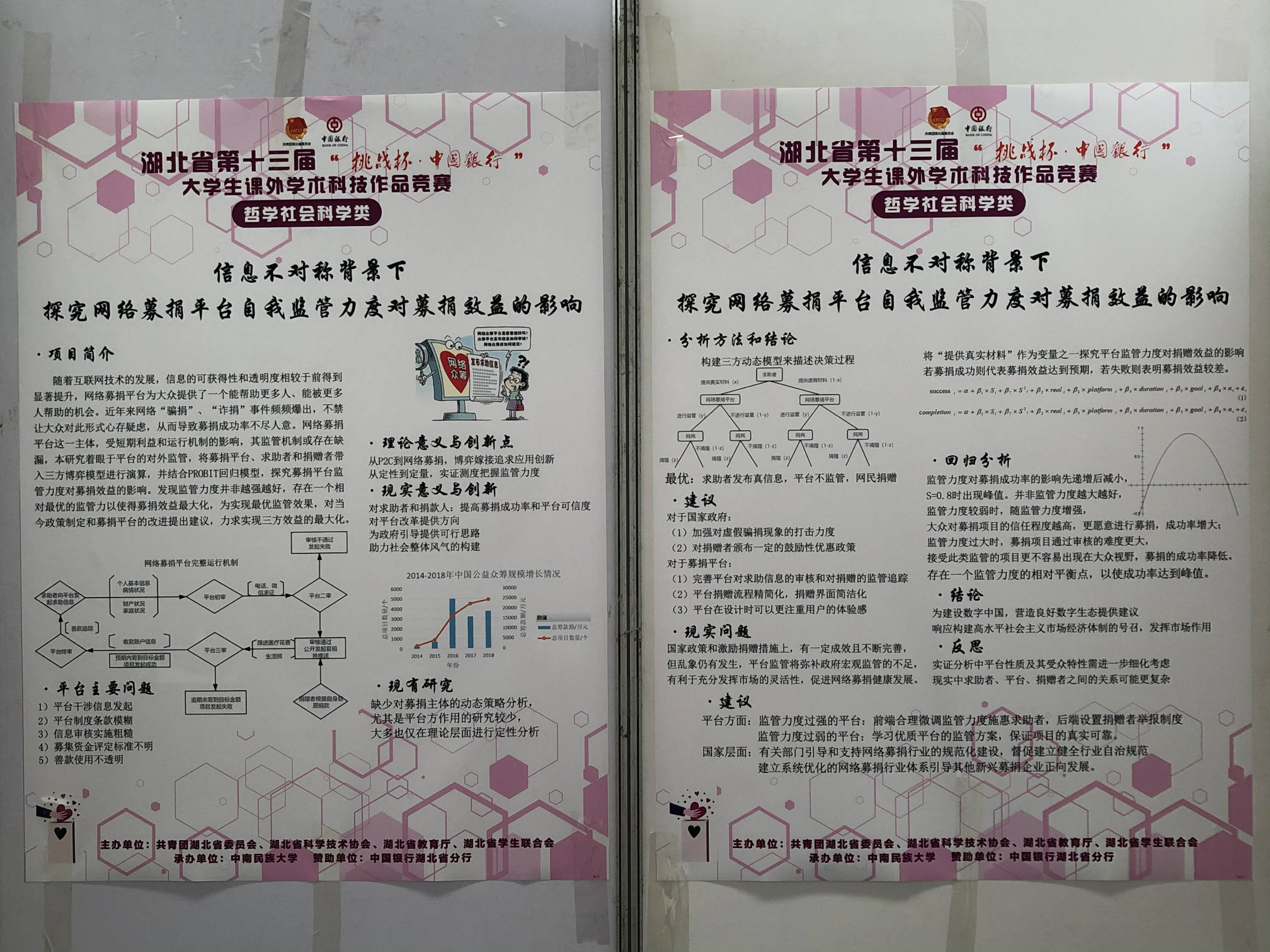 (通讯员/吴雨 刘千惠)2021年5月9日上午8时,由团省委、省科协、省教育厅、省学联共同主办的湖北省第十三届“挑战杯·中国银行”大学生课外学术科技作品竞赛终审决赛暨闭幕式在中南民族大学举行。我校斩获一等奖2项,二等奖4项,三等奖6项,并获得“优胜杯”荣誉称号,获奖作品数量创历史新高。其中,麻豆视频 队伍参赛作品《信息不对称背景下,探究网络募捐平台自我监管力度对募捐效益的影响》荣获二等奖;同时,本项目也在校内第七届“明理杯”大学生创新创业竞赛创新类中荣获二等奖。