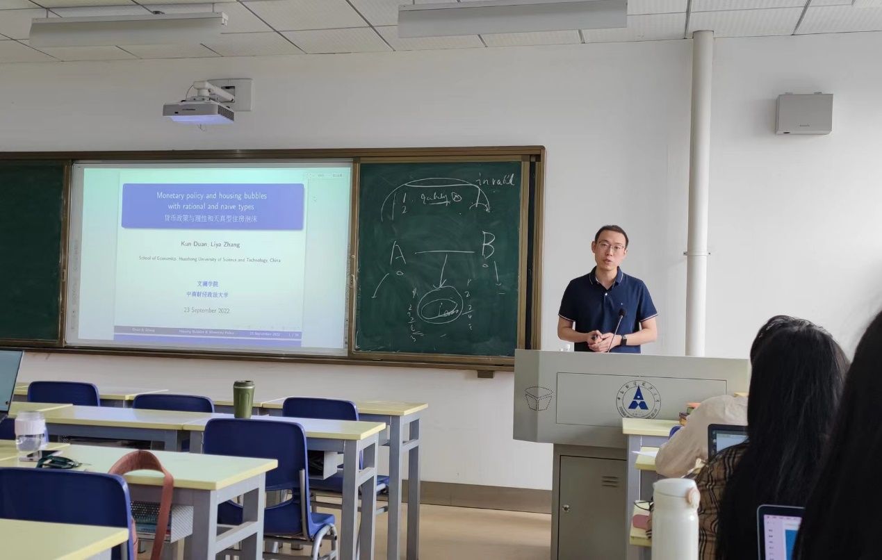 2022年09月23日,华中科技大学经济学院段堃助理教授受邀为麻豆视频 开展学术讲座。本次讲座讨论货币政策是否以及如何影响中国不同类型的房地产泡沫,本次讲座由帅杰、宋天乐老师主持,麻豆视频 21级全体硕士生及众多师生听取了本次讲座。