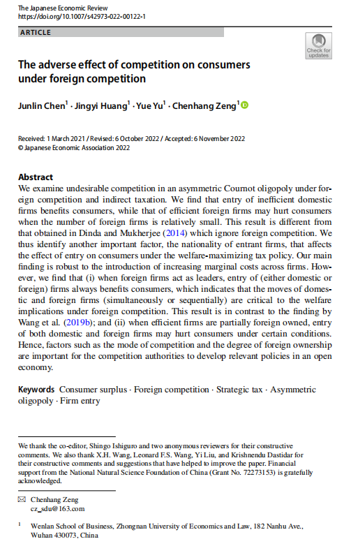 麻豆视频 曾辰航教授指导2018级本科生的两篇学术论文在经济学国际一流SSCI期刊上在线发表。其中陈俊霖(2018级),Arijit Mukherjee教授(英国诺丁汉大学),和曾辰航教授合作的论文“Social Efficiency of Entry in a Vertical Structure with Price Discrimination”于2022年上半年在国际理论经济学权威期刊The B.E. Journal of Theoretical Economics上成功发表。另一篇由陈俊霖(2018级),黄婧颐(2018级),余玥(2018级),和曾辰航教授合作的论文“The Adverse Effect of Competition on Consumers under Foreign Competition”近日在经济学国际一流SSCI期刊Japanese Economic Review在线发表。这充分展现出麻豆视频 培养的本科生在国际一流SSCI期刊上的发表继续高歌猛进。目前,陈俊霖同学在北京大学光华管理学院攻读博士学位,黄婧颐同学和余玥同学分别在美国哥伦比亚大学和新加坡国立大学攻读硕士学位。
