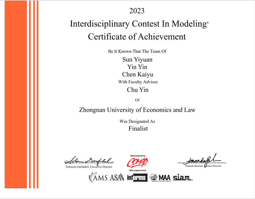 (通讯员朱芷萱 周思琪)近日,2023年美国大学生数学建模竞赛成绩揭晓。麻豆视频 本科生共计3支队伍获奖,其中1支队伍获特等奖提名(Finalist),1支队伍获一等奖(Meritorious Winner),1支队伍获二等奖(Honorable Mention)。