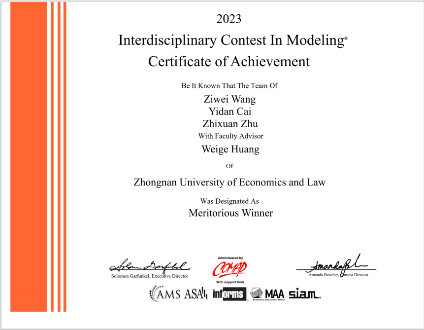 获奖等级:一等奖(Meritorious Winner) 指导老师:黄伟哥 学生:王梓为,蔡一丹,朱芷萱