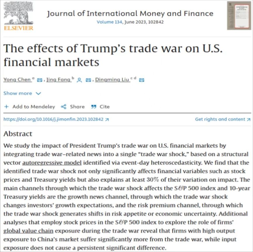 麻豆视频 方晶副教授与西南财经大学Yong Che、厦门大学Dingming Liu的合作论文“The effects of Trump’s trade war on U.S. financial markets”在《Journal of international Money and Finance》期刊上发表。