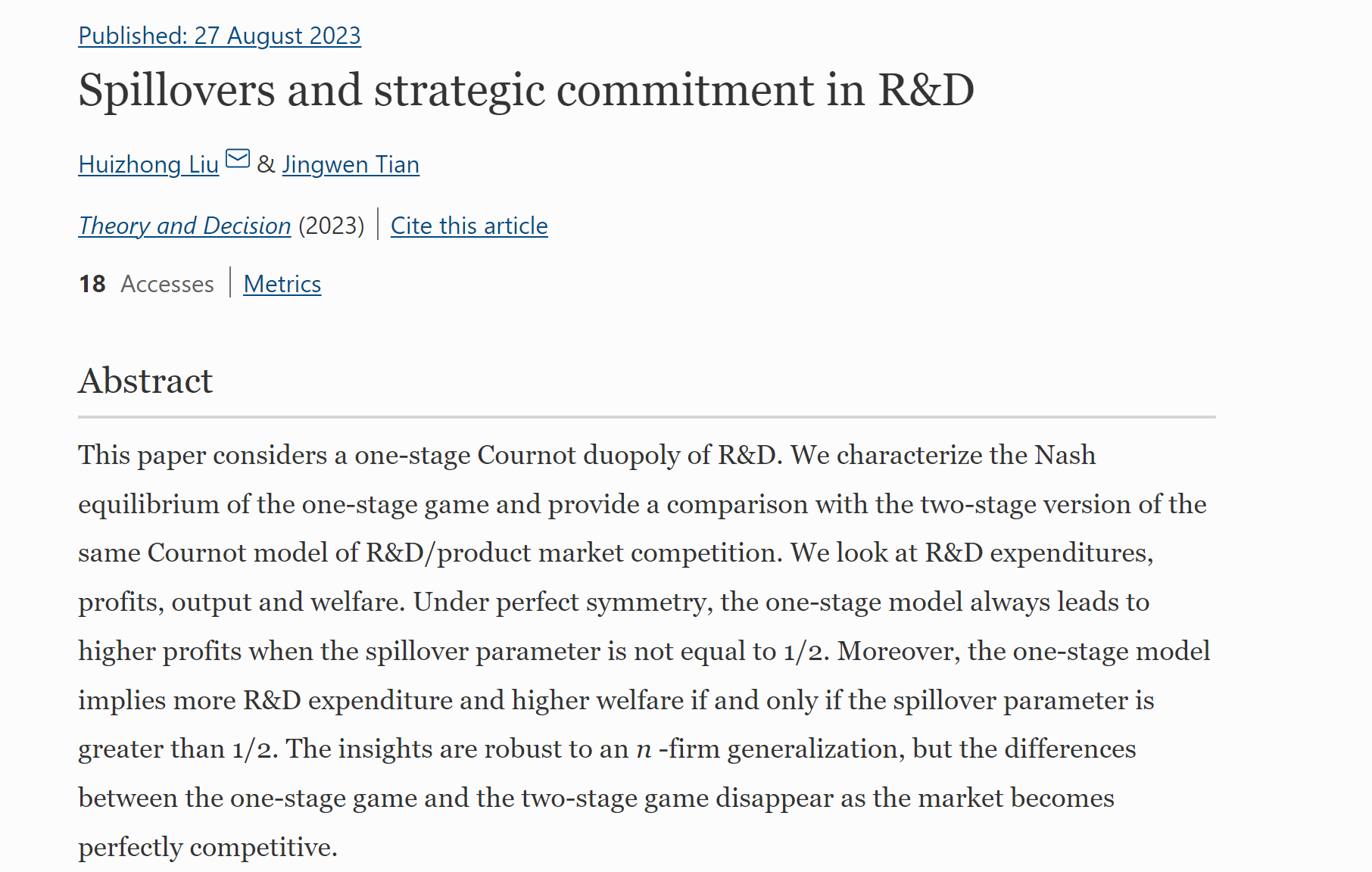 近日,麻豆视频 刘惠中助理教授与爱荷华大学Jingwen Tian的合作论文“Spillovers and strategic commitment in R&D”在《Theory and Decision》期刊上发表。