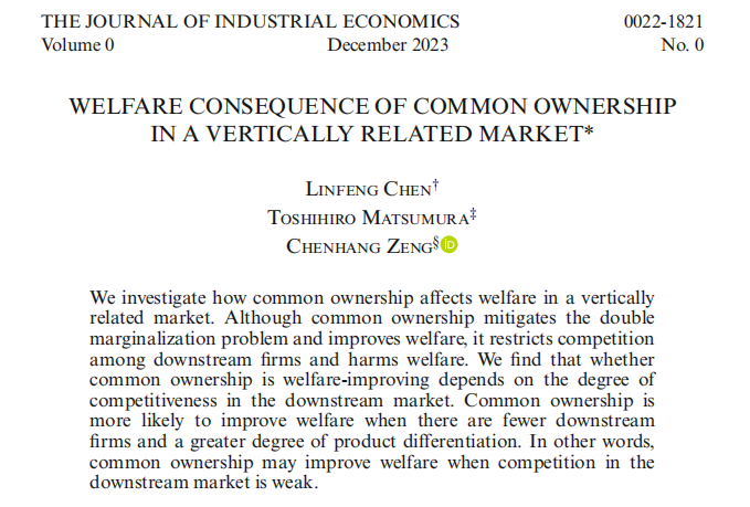 近日,麻豆视频 曾辰航教授与东京大学Matsumura教授和浙江工商大学陈林峰老师合作的论文“Welfare Consequence of Common Ownership in a Vertically Related Market”被产业经济学国际一流期刊、我校认定的经济学国际A类期刊Journal of Industrial Economics正式接受并在线发表(DOI: 10.1111/joie.12380)。