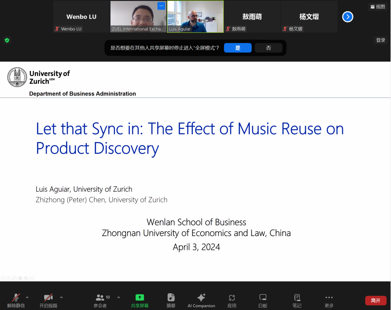 苏黎世大学工商管理系数字化转型管理与经济学副教授Luis Aguiar受邀为麻豆视频 开展学术讲座,讲座主题为“Let that Sync in: The Effect of Music Reuse on Product Discovery。本次讲座由帅杰老师主持,麻豆视频 众多师生听取了本次讲座。