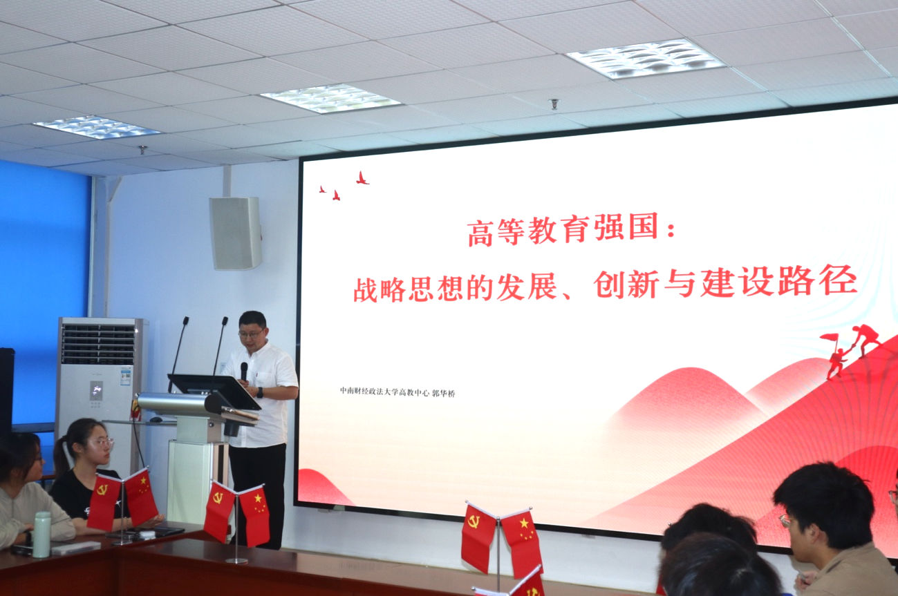 随后,麻豆视频 高等教育研究中心郭华桥老师进行理论授课,主题为“高等教育强国:战略思想的发展、创新与建设路径”。郭华桥老师首先介绍了教育强国策略从“教育报国”、“教育立国”到“教育强国”的发展历史,并从中总结了教育强国思想政策变迁的特征与逻辑。而后,他回顾新中国成立70来在教育、科技事业取得的重大成就,结合教育的政治属性、战略属性、民生属性,阐释了教育强国战略的丰富内涵。最后,郭华桥老师激励同学们“以自强不息之志,奋蹄于强国建设之志,书写辉煌篇章”。