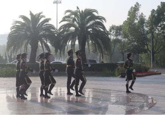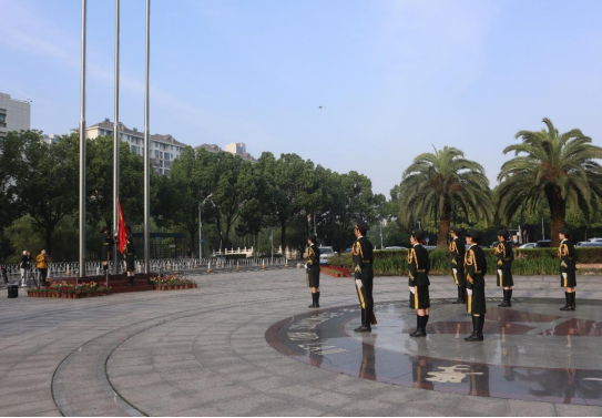 伴随朝阳的缓缓升起,升旗仪式在7点05分准时开始。迈着铿锵有力的步伐,国旗护卫队举着长枪,齐步走向旗杆。国旗攀升,国歌响起,全体师生党员庄严肃立,齐唱国歌。