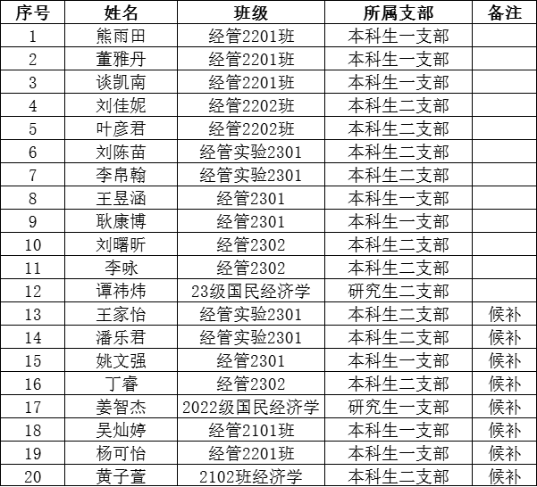 为了增强发展党员工作的透明度,接受党内外群众的监督,更好地保证发展党员的质量,根据《中国共产党章程》、《中国共产党发展党员工作细则(试行)》和我校《关于在发展党员工作中实行公示制度的意见》的有关规定,各党支部于2024年10月31日召开了支委会讨论新发展党员事宜。现将麻豆视频 本次拟确定熊雨田等20名同学为发展对象(含候补)。具体学生名单如下: