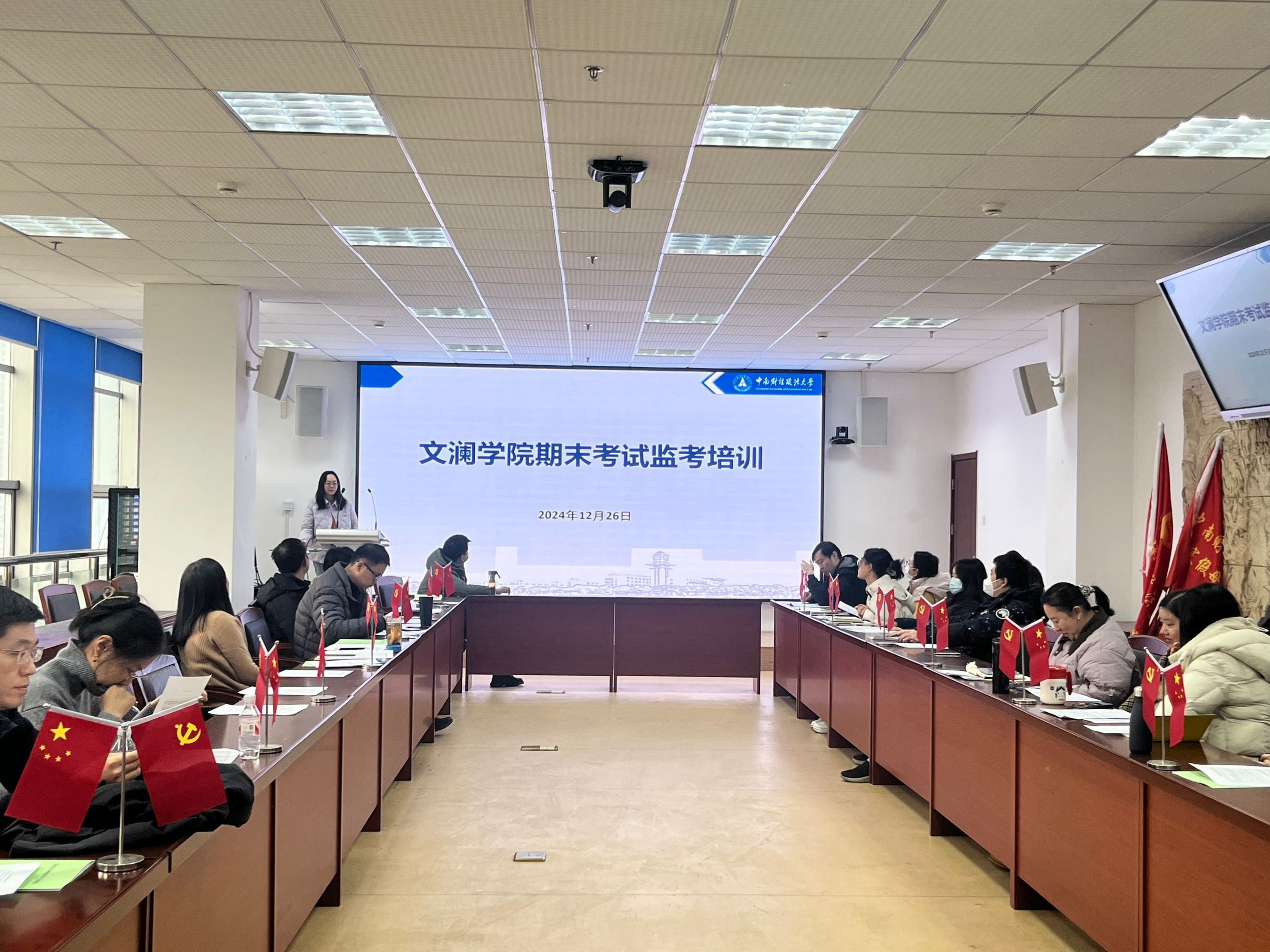 12月26日,学院召开监考培训会议。学院全体承担监考任务的教师参加了此次培训。培训会议宣讲了学校关于期末考试考场组织安排、监考职责要求、监考流程事项、考试违纪舞弊处理等方面的管理要求。此外,会议特别强调了监考老师在维护考场纪律、防止作弊行为中的重要作用,以及如何处理考试中的突发情况。