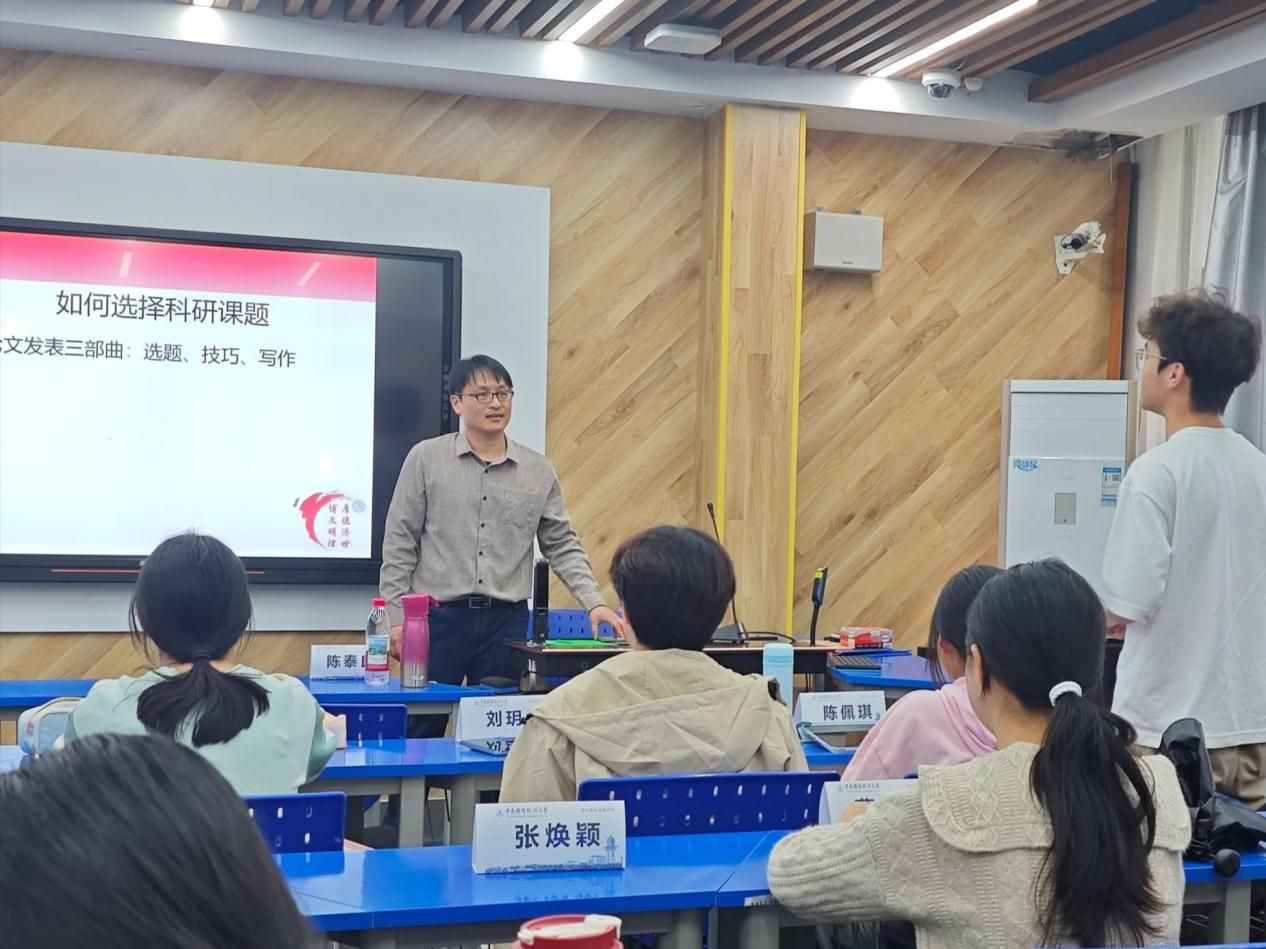 开营仪式结束后,陈泰良教授开始澜英智汇营的第一次授课,主题是选题与研究方向确定。陈泰良教授从如何选择科研课题、研究方向的重要性与确定方法、科研选题的创新性与可行性分析以及实例分析四个角度深入阐述,用幽默风趣的语言和身边有参考价值的例子,给同学们上了一节生动有趣的科研启蒙课。陈泰良教授强调到,选题不要脱离实际,要观察现实问题、社会热点和时代背景,多阅读财经类新闻资讯,提升知识面的广度,提出有意义的选题。
