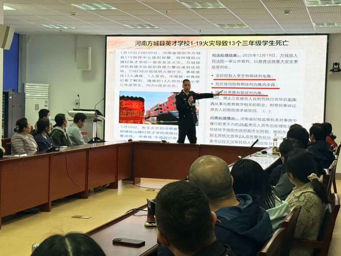 讲座伊始,教官以 “预防为主,生命至上” 为核心主题开篇,通过触目惊心的火灾数据与近年典型火灾案例,直观展现了火灾事故的严重危害,深刻阐释了校园消防安全工作的重要性与紧迫性。教官结合河南方城县英才学校 “1・19”火灾等真实案例,深入剖析了火灾发生的常见诱因,详细讲解了日常火灾预防要点,同时系统介绍了火灾发生时的正确报警流程、初期火灾扑救方法、火场逃生自救技巧等关键知识,让教职工对火灾的预防与应对有了全面、清晰的认知。
